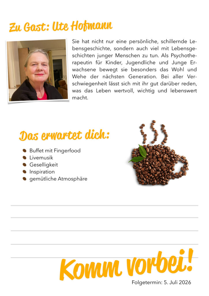 In unseren gemütlich umgebauten Räumen bieten wir einen Raum zur Begegnung. Neben einem Fingerfood- Buffet, Getränken & Livemusik erwartet sie ein inspirierender Input. Jeweils ein geladener Gast wird uns in seinen Alltag mitnehmen und während einem kurzen Interview berichten.